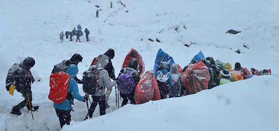 म्याग्दी, ११, कार्तिक । मौसममा आएको खराबी र हिमपातका कारण अन्नपूर्ण प्रथम आधार शिविर क्षेत्रमा पुगेका पर्यटकको सहजीकरणका लागि सुरक्षाकर्मीको टोली परिचालन गरिएको छ । म्याग्दीको अन्नपूर्ण गाउँपालिका–४ नारच्याङको अन्नपूर्ण आधार शिविर क्षेत्रमा गएरातिदेखि हिमपात भइरहेको छ ।